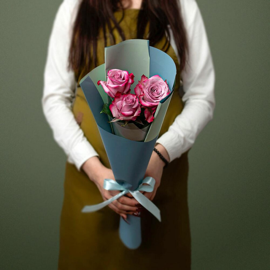 На фото букет из 3 фиолетовых роз. В составе: роза 3 шт, дизайнерская упаковка 1 шт, атласная лента 1 шт, . Все цветы свежие и ароматные, букет красиво оформлен и отлично подходит для подарка. Доступна доставка цветов или самовывоз.