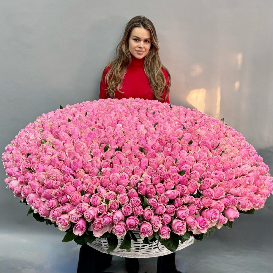 На фото букет из 501 розовой розы «очарование». В составе: роза 501 шт, корзина (xl) 1 шт, оазис флористический 4 шт, . Все цветы свежие и ароматные, букет красиво оформлен и отлично подходит для подарка. Доступна доставка цветов или самовывоз.